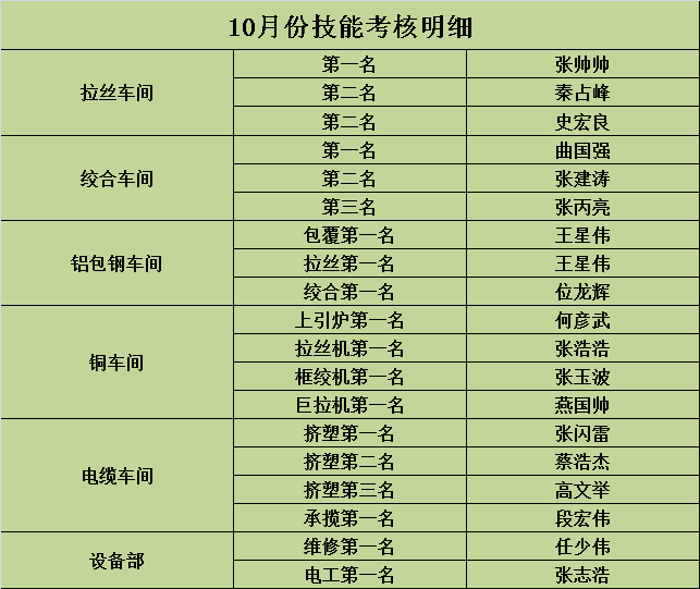 鋁包鋼車間:雙拉1、2號機員工在本月工作中在質量、生產(chǎn)、7S方面表現(xiàn)突出被公司評為優(yōu)秀三好班組:共4人(張迎賓 肖騰飛 張流斌 李朋雷)。