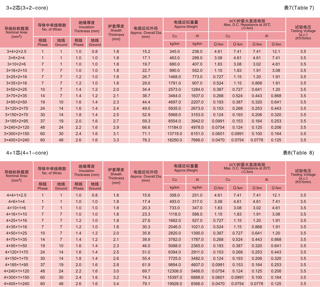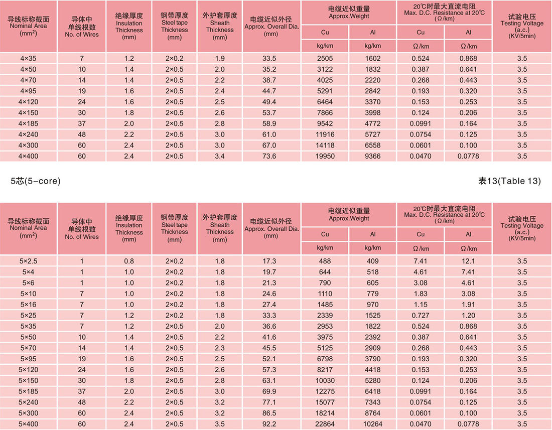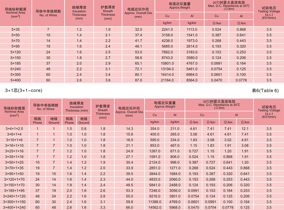 0.6/1kV PV℃絕緣鋼帶鎧裝PV℃護套阻燃或非阻燃電力電纜(見表9-16)