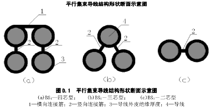 平行集束電纜一般采用四根導線呈正方形對稱布置,導線之間由絕緣層及筋帶相互平行的連接在一起(其它導體結(jié)構(gòu)還有兩等芯、三等芯、四等芯。)